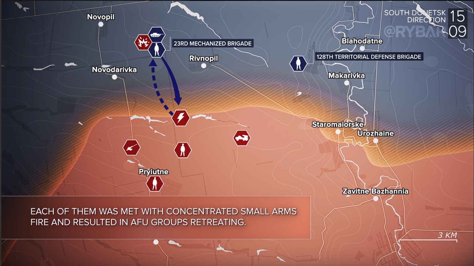 ▪️Tại khu vực Vremevsky, kẻ thù lại thực hiện nhiều nỗ lực tấn công các vị trí của Nga trong vành đai rừng phía bắc Priyutnoye. Mỗi người trong số họ đều phải đối mặt với hỏa lực vũ khí nhỏ tập trung và kết thúc bằng sự rút lui của đội hình Ukraine.