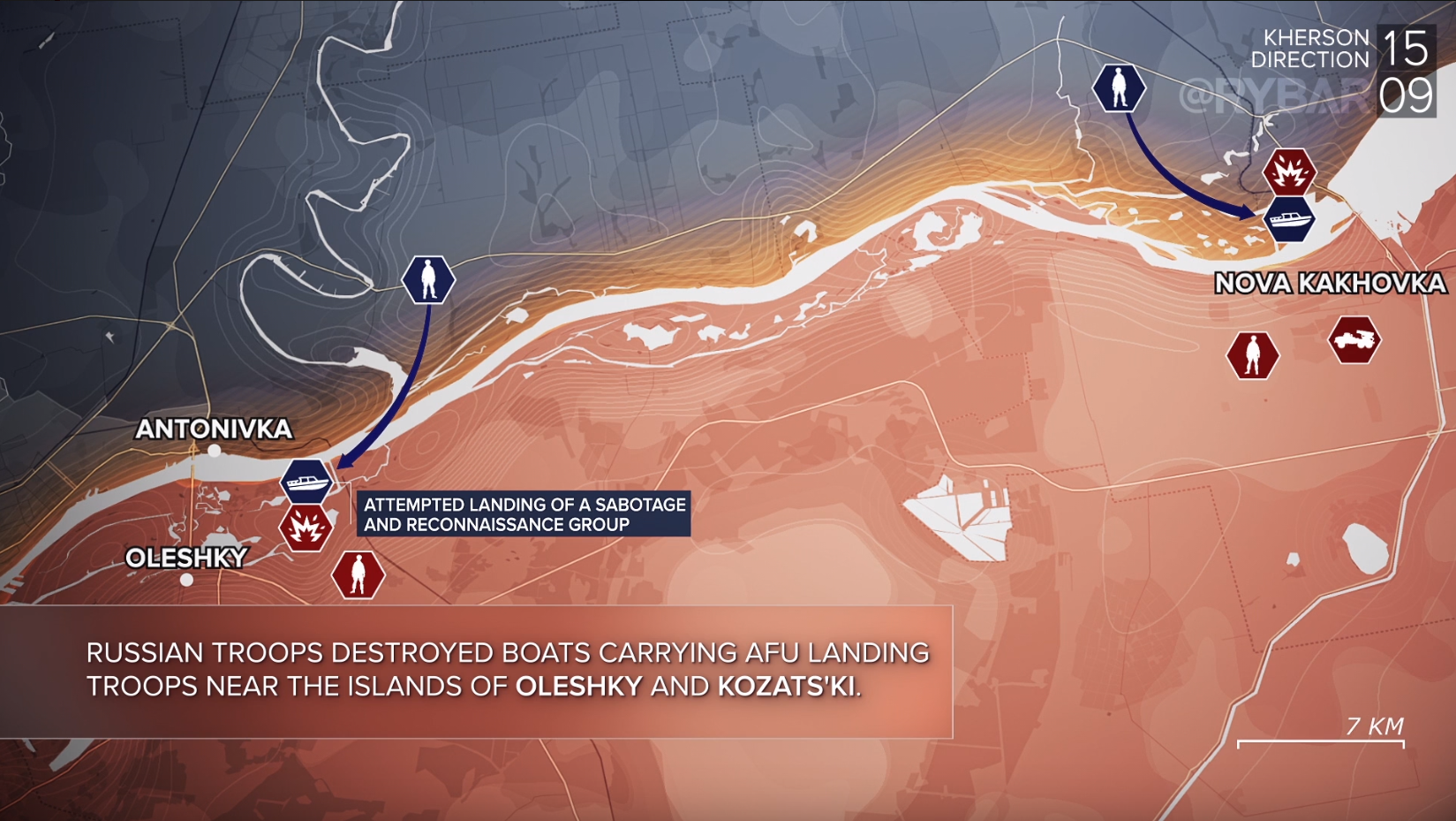 ▪️Trên hướng Kherson, các nhóm trinh sát địch lại cố gắng củng cố trên các đảo thuộc đồng bằng Dnieper. Quân đội Nga đã phá hủy các tàu chở quân Ukraine gần các đảo Aleshkinsky và Kozatsky.