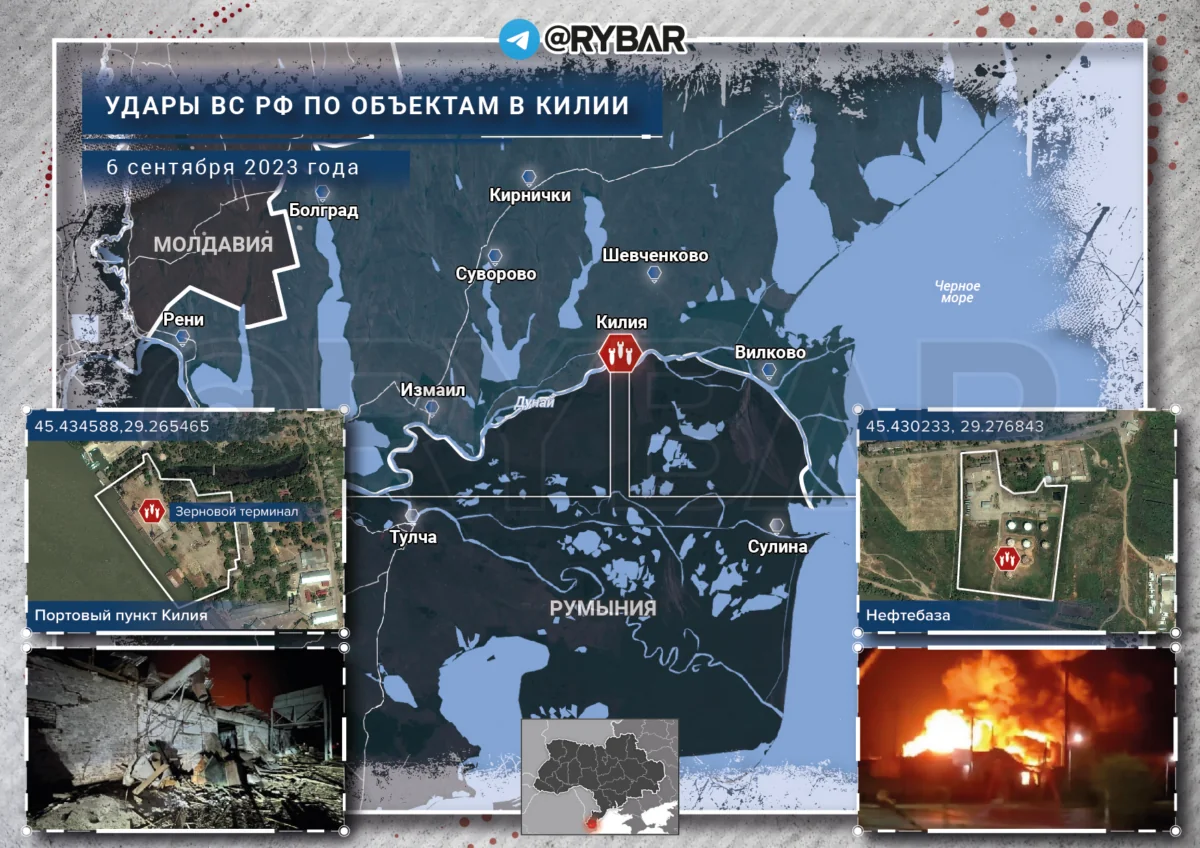 Vào ban đêm, quân đội Nga lại tấn công các mục tiêu ở vùng Odessa bằng máy bay không người lái cảm tử "Geran". Một số chuyến UAV đến đã diễn ra trên cơ sở hạ tầng tại cảng Killia trên sông Danube. Theo các nguồn mở, có thể xác định vị trí thiệt hại do máy bay không người lái gây ra đối với các thùng nhiên liệu tại một kho dầu địa phương, cũng như kho ngũ cốc Davos-Agro.