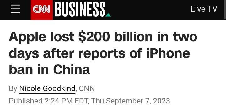 Giá trị của Apple giảm mạnh 200 tỷ USD chỉ trong 48 giờ sau báo cáo về lệnh cấm iPhone ở Trung Quốc.