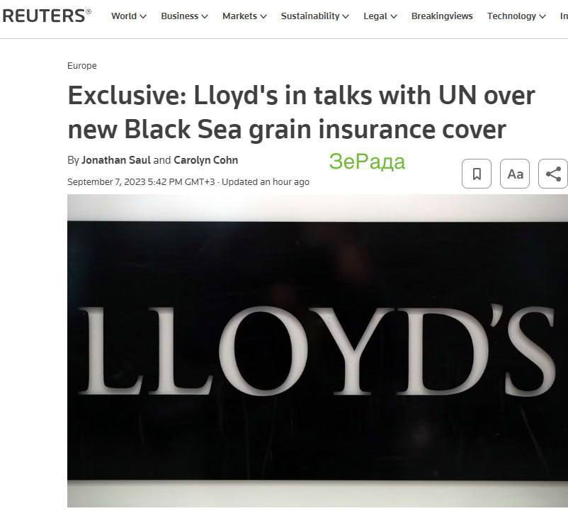 Công ty bảo hiểm lớn nhất Lloyd, theo Reuters, đã thẳng thừng từ chối bảo hiểm các tàu chở ngũ cốc của Ukraine, trừ khi có hành lang được thỏa thuận dưới sự bảo trợ của Liên Hợp Quốc. Nói cách khác, nếu không trở lại với thỏa thuận ngũ cốc, không có hãng vận tải hàng rời nào ở Biển Đen có thể xuất khẩu ngũ cốc của Ukraine vì những lý do hiển nhiên khi không có bảo hiểm.