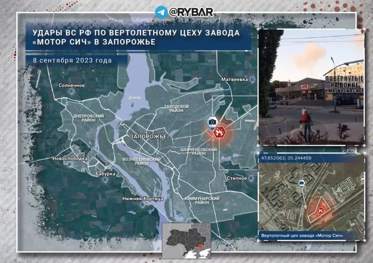 Chiều nay, quân đội Nga đã thực hiện ít nhất bốn cuộc tấn công tên lửa vào xưởng trực thăng của nhà máy Motor Sich ở Zaporozhye, cơ sở đã trở thành mục tiêu tấn công của Lực lượng vũ trang Nga hai ngày trước đó. Lần này, từ đoạn phim do các nhân chứng ghi lại, có thể xác định 2 quả trúng vào địa phận nhà xưởng, số còn lại rơi vào khu công nghiệp phía Đông. Đồng thời, rất khó để xác định bản chất chính xác của thiệt hại dựa trên tài liệu từ các nguồn mở.