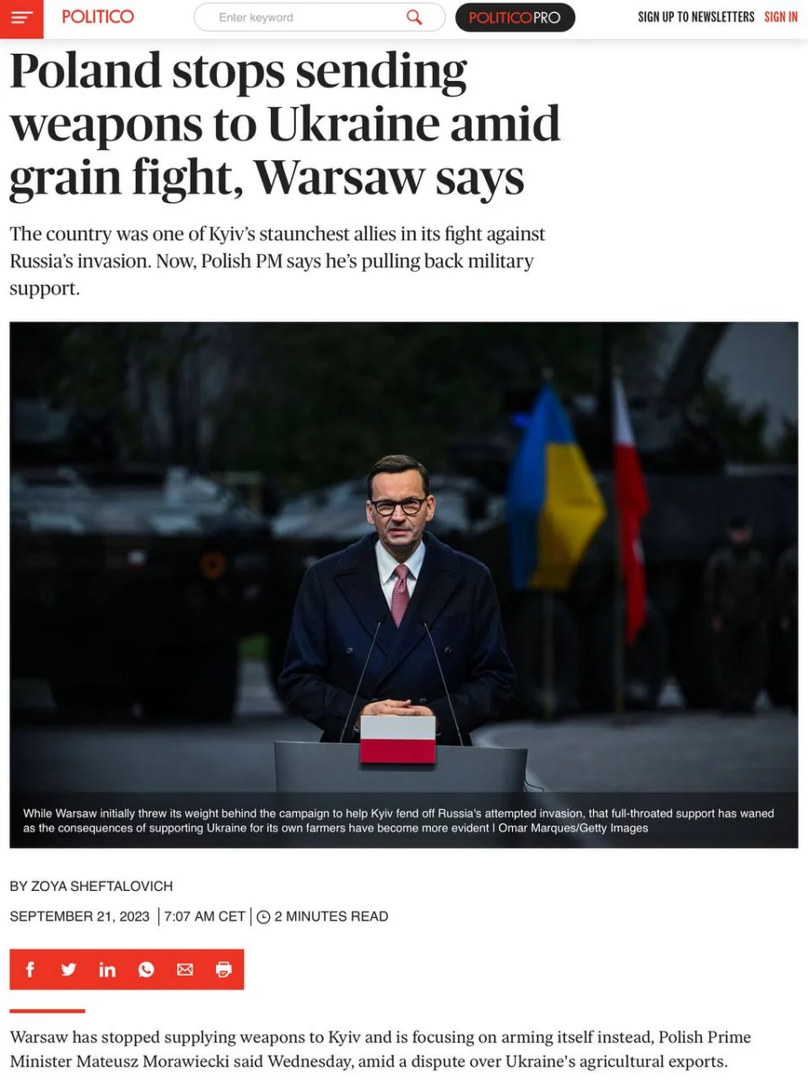 Tin vui hay buồn sáng nay? - Zelensky hứng đòn đầu tiên trong khi Đại hội đồng LHQ đang diễn ra tại New York: Thủ tướng Ba Lan Mateusz Morawiecki đêm qua tuyên bố trong cuộc phỏng vấn với kênh truyền hình Polsat rằng Ba Lan không cung cấp bất kỳ loại vũ khí nào nữa cho Ukraina vì bản thân Ba Lan đang tái vũ trang quân đội của mình bằng những loại vũ khí hiện đại nhất, - TASS đưa tin.