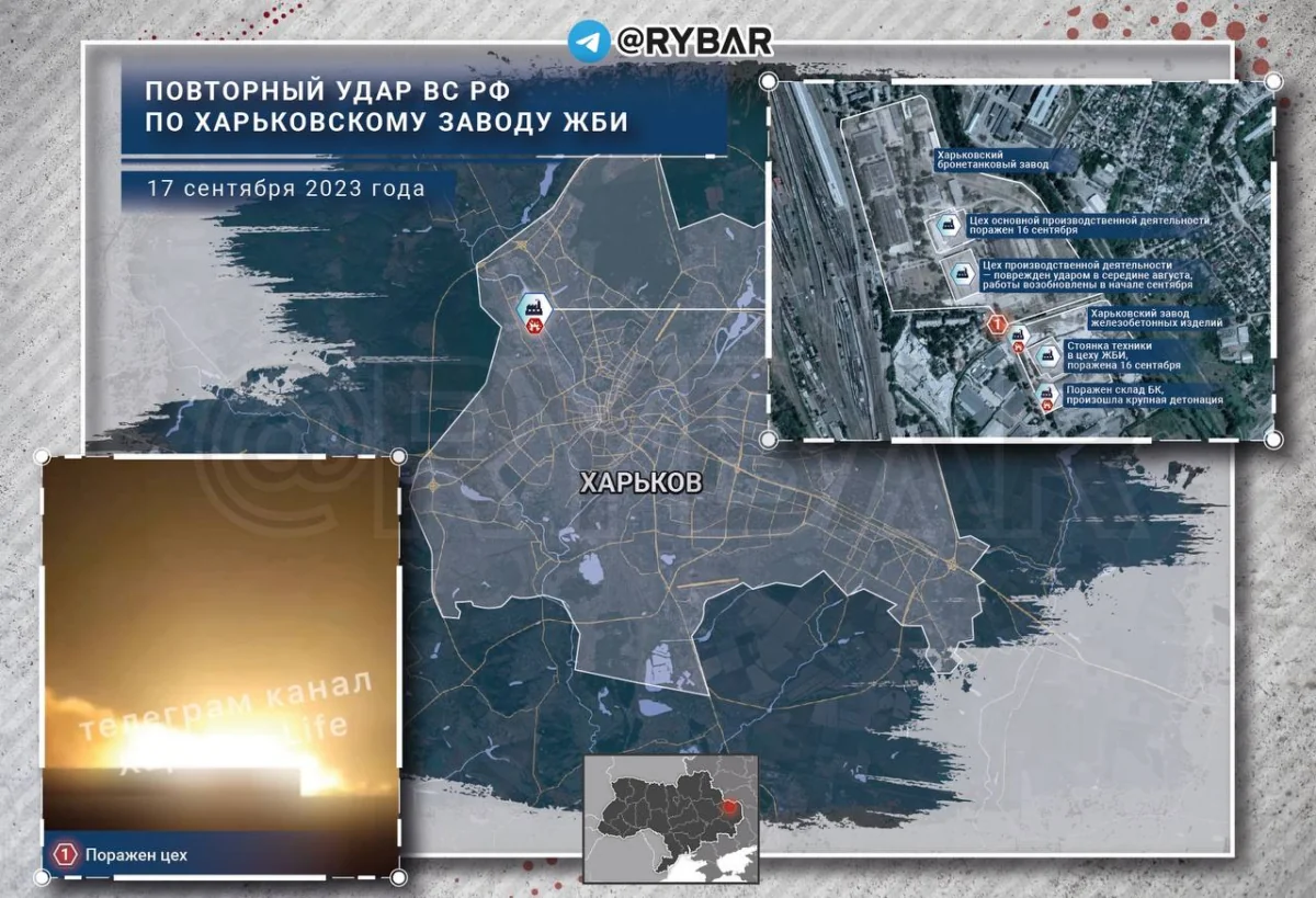 Đây là vụ tấn công thứ hai tại khu vực lân cận doanh nghiệp trong ngày: sáng ngày 16/9, Lực lượng vũ trang Nga đã tấn công chính xác vào một trong hai xưởng sản xuất chính tại KhBTZ, đồng thời tấn công chính xác vào bãi đỗ rất nhiều xe bọc thép trong nhà máy bê tông cốt thép. Cả hai cơ sở đều thực sự có tầm quan trọng lớn đối với kẻ thù: cơ sở thứ nhất liên tục sửa chữa xe tăng kể từ mùa xuân năm 2022, và cơ sở thứ hai được dùng làm kho chứa các xe bọc thép đã sửa chữa trước khi chất lên ga để vận chuyển ra tiền tuyến. . Hóa ra ở đó còn có một kho đạn dược.