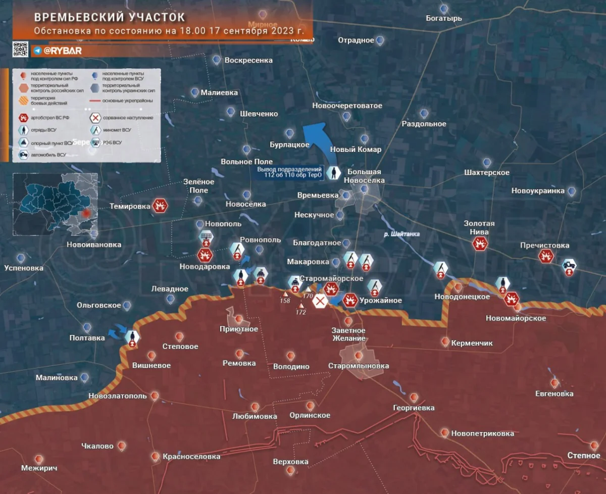 Tại khu vực Vremevsk, sau những nỗ lực tấn công không thành công và không giành được chỗ đứng tại các vị trí trong khu vực các làng Novomayorskoe và Novodonetskoe, các đơn vị của Lực lượng vũ trang Ukraine đã chuyển sang chiến tranh phòng thủ và chiến tranh theo vị trí nhằm đảo quân và bổ sung cho các nhóm xung kích. Theo kênh tin Chiến binh Viễn Đông, tại khu vực phía bắc Novomayorskoe, địch thuộc Lữ đoàn bộ binh 35 buộc phải rút lui do mất khả năng chiến đấu. Vì lý do tương tự, một trong các tiểu đoàn của lữ đoàn bảo vệ lãnh thổ số 110 của Lực lượng vũ trang Ukraine đã được rút hoàn toàn khỏi khu vực chiến đấu và thay thế bằng các đơn vị của lữ đoàn bảo vệ lãnh thổ 127.