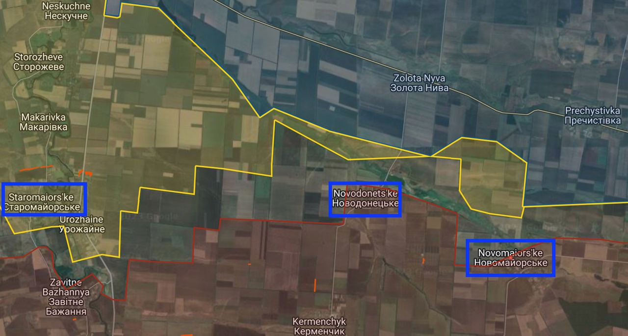 Pyatikhatki là một vùng xám. Rabotino - phía bắc và một phần trung tâm của Lực lượng Vũ trang Ukraine, vùng ngoại ô phía nam - Lực lượng Vũ trang Liên bang Nga. Một phần là một khu vực màu xám. Verbovoe – Lực lượng vũ trang RF Priyutnoye – Lực lượng vũ trang RF Urozhaynoe – APU Staromayorskoye - 2/3 dành cho Lực lượng Vũ trang Ukraine, phần còn lại là vùng xám Novodonetskoye - Lực lượng vũ trang RF Novomayorskoye - Lực lượng vũ trang RF