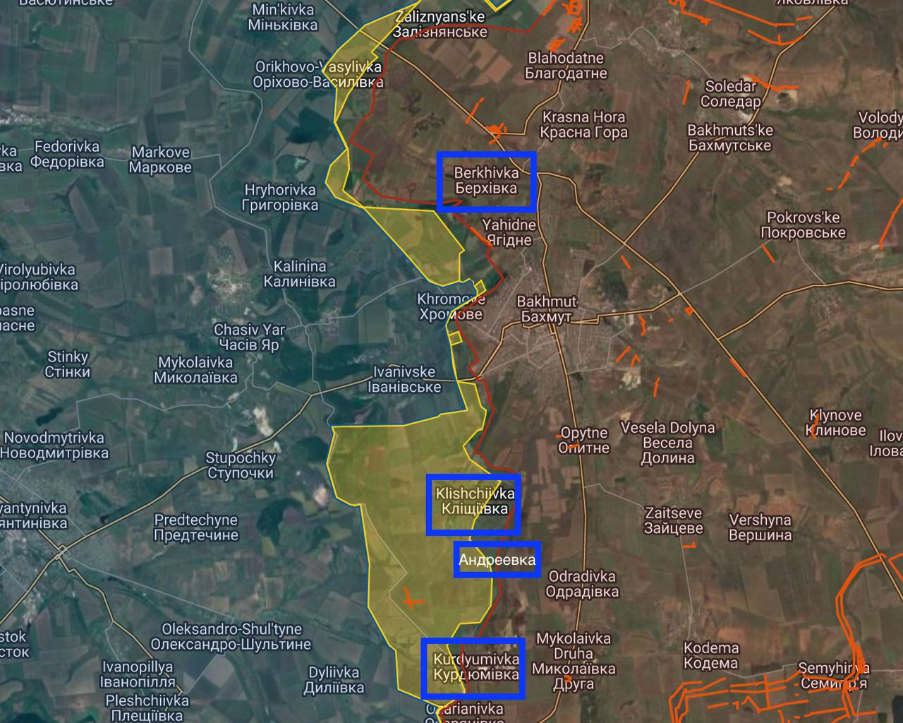 Kleshcheevka - phía nam và một phần trung tâm thuộc Lực lượng vũ trang Ukraine, phần còn lại là vùng xám, các vị trí của Lực lượng vũ trang Nga nằm ở ngoại ô phía bắc và phía sau tuyến đường sắt. Andreevka - phần lớn ngôi làng bị phá hủy là vùng xám. Vị trí của chúng tôi ở gần đường sắt. APU tại các đồn điền lân cận và ở vùng ngoại ô phía Tây. Kurdyumovka - Lực lượng vũ trang RF. Berkhovka – Lực lượng vũ trang RF Zheleznodorozhnoe - Lực lượng vũ trang RF.