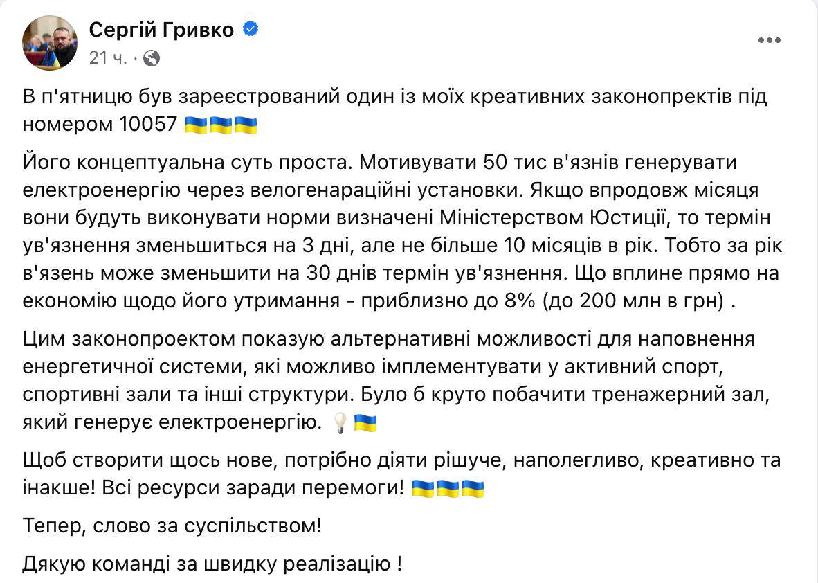 “Nếu trong vòng một tháng họ tuân thủ các tiêu chuẩn do Bộ Tư pháp quy định thì thời hạn phạt tù sẽ giảm 3 ngày, nhưng không quá 10 tháng mỗi năm. Nghĩa là, trong thời gian một năm, tù nhân có thể giảm thời hạn phạt tù xuống 30 ngày. Điều này sẽ ảnh hưởng trực tiếp đến số tiền tiết kiệm được cho nội dung của anh ấy – lên tới khoảng 8% (lên tới 200 triệu UAH),” Grivko viết.