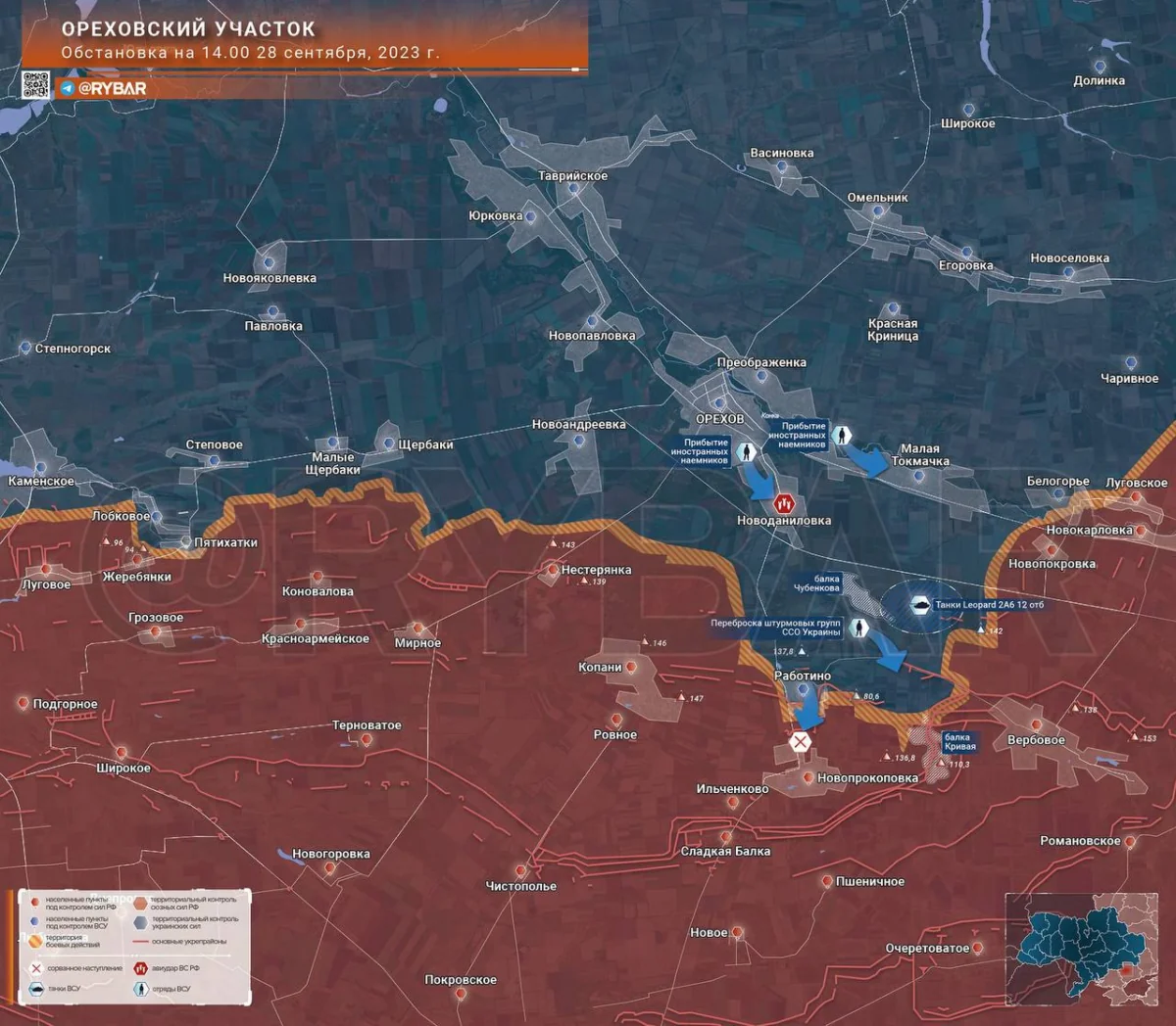 Ngoài ra, trên chiến tuyến còn có hai xe tăng Leopard 2A6 do Đức sản xuất thuộc tiểu đoàn xe tăng riêng biệt số 12. Và lính đánh thuê nước ngoài đã được chuyển đến Malaya Tokmachka và Novodanilovka. Đồng thời, trong những tuần gần đây, Lực lượng Vũ trang Ukraine đã phải chịu tổn thất đáng kể do hành động của Lực lượng Hàng không Vũ trụ Nga, lực lượng đang tích cực thực hiện các cuộc không kích vào tiền tuyến bằng bom chứa UMPC. Cường độ sử dụng ngày càng tăng buộc đối phương phải chuyển thêm các hệ thống phòng không do phương Tây sản xuất đến địa điểm này.