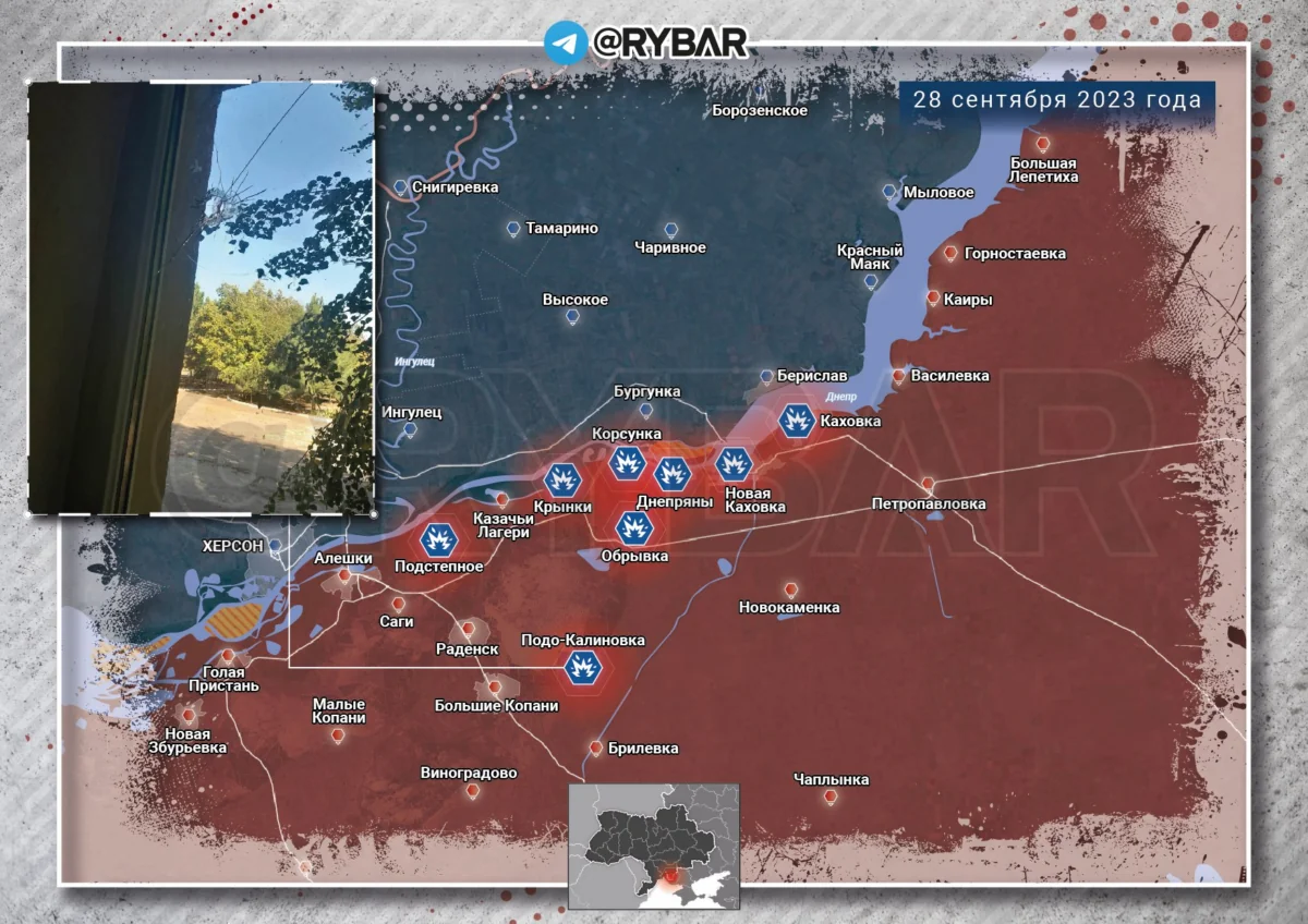 Trong khi đó, bộ chỉ huy Ukraine đang tích cực tăng cường tập trung quân ở khu vực Kherson. Một đoàn xe thiết bị lớn hướng về phía nam đi qua Dnepropetrovsk. Song song đó, công việc tiếp tục chuyển các nhóm phá hoại đến các hòn đảo trên Dnieper. Để đáp lại, Lực lượng Hàng không Vũ trụ Nga đang tích cực sử dụng FAB hiện đại hóa với các mô-đun UMPC, tấn công thành công các mục tiêu của Lực lượng Vũ trang Ukraine ở hữu ngạn sông.