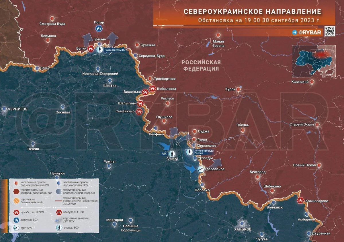 Các lực lượng Ukraine đang tăng cường hoạt động ở khu vực Sumy và Chernigov gần biên giới Nga. Nhiều đơn vị khác nhau của Lực lượng Vũ trang Ukraine đang hội tụ về khu vực, bao gồm cả các đơn vị từ RDK và Quân đoàn Tự do Nga. Các bước đột phá mới vào các khu vực biên giới của Liên bang Nga đã được lên kế hoạch.