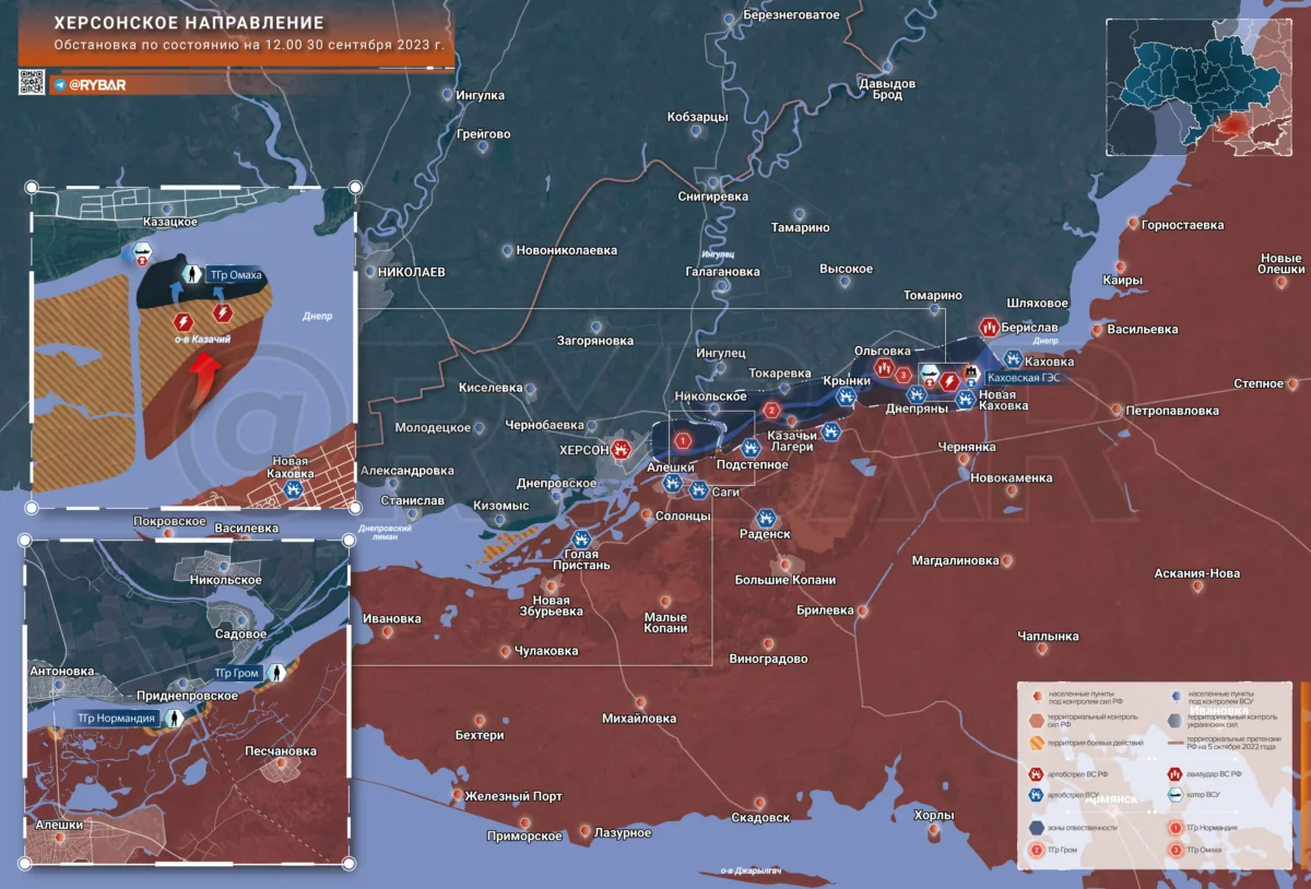 Tại khu vực đảo Dnieper, các nhóm chiến thuật Ukraine (TG) tiếp tục giành được chỗ đứng trên các đảo và ở bờ trái. Các đơn vị đặc nhiệm “Normandy” và “Grom” luân chuyển các nhóm tiền phương trên các đảo Alekseevsky và Aleshkinsky.