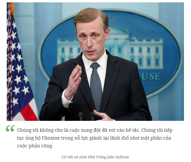 "Chúng tôi không cho là cuộc xung đột đã rơi vào bế tắc. Chúng tôi tiếp tục ủng hộ Ukraine trong nỗ lực giành lại lãnh thổ như một phần của cuộc phản công",Politicodẫn tuyên bố của cố vấn an ninh Nhà Trắng Jake Sullivan.