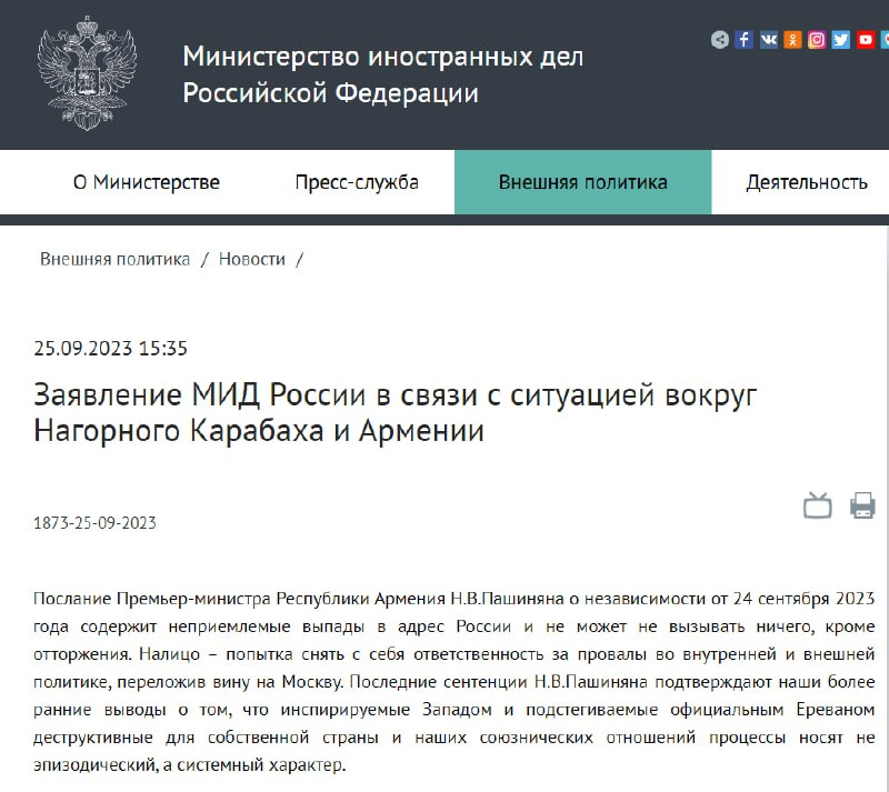 Bộ Ngoại giao Nga cho rằng lời nói của Pashinyan ngày 24/9 với các cuộc tấn công nhằm vào Nga và lực lượng gìn giữ hòa bình Nga là không thể chấp nhận được và chỉ gây ra sự bác bỏ.