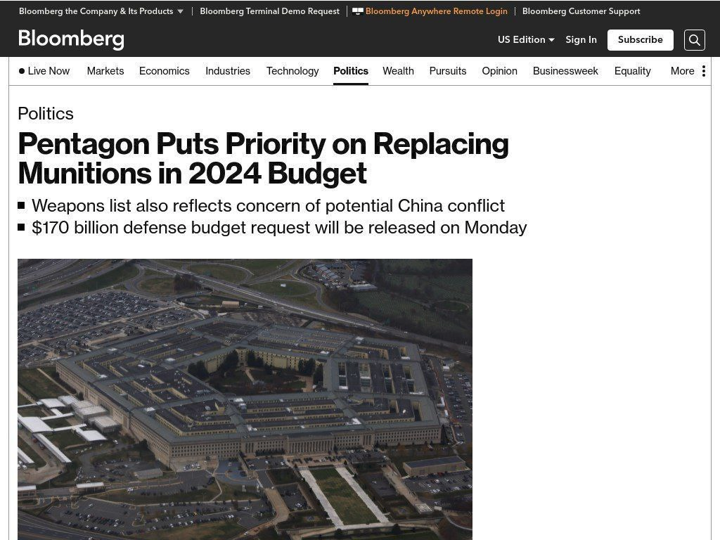 Theo một tài liệu ngân sách nội bộ, yêu cầu mua sắm trị giá 170 tỷ USD của Lầu Năm Góc cho năm tài chính mới tập trung vào việc thay thế đạn dược cung cấp cho Ukraine cũng như các loại vũ khí như tên lửa tầm xa, vốn cần thiết trong một cuộc xung đột với Trung Quốc.