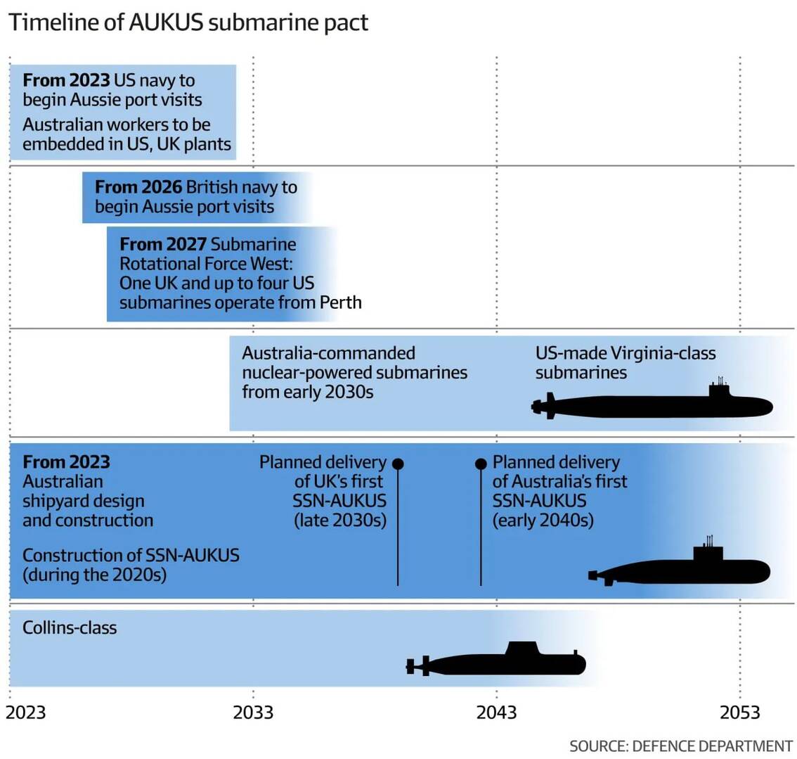 ▪️ Đầu những năm 2030, Australia sẽ mua 3 tàu ngầm lớp Virginia của Mỹ và có kế hoạch đóng 5 tàu ngầm SSN-AUKUS loại mới tại Adelaide với thời gian giao hàng dự kiến vào năm 2055. Chiếc thuyền đầu tiên do Úc đóng sẽ được giao cho Hải quân vào năm 2042.