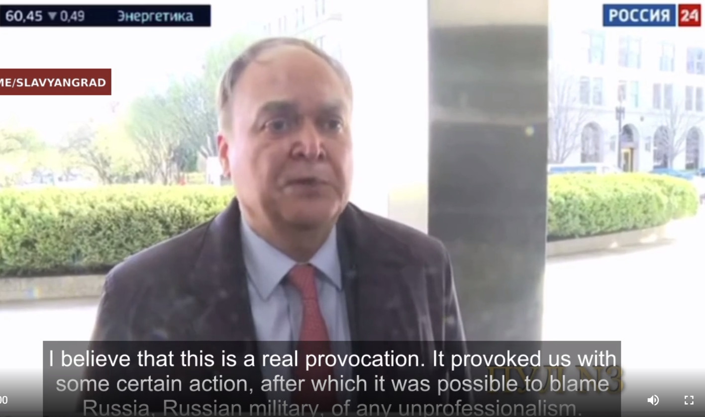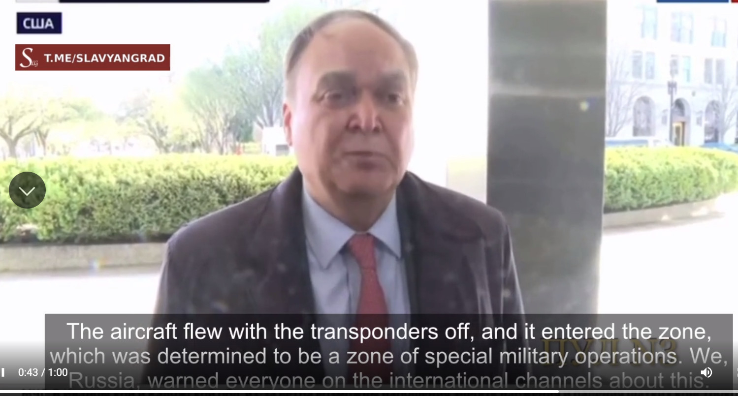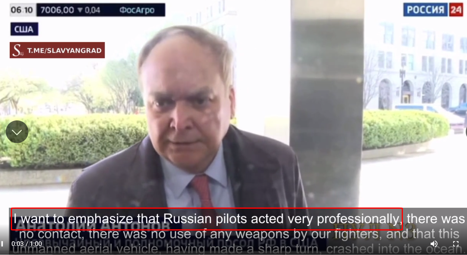 BQP Nga: Hôm nay, đồng chí phi công trung úy Ivan cùa chúng tôi đã làm điều dại dột. Cụ thể đồng chí đã bay không an toàn làm rớt con trình sát của người ae Mỹ thượng đẳng đáng kính trọng. Chúng tôi đã nghiêm khắc cảnh cáo đồng chí đại úy Ivan. Nếu tiếp tục tái diễn chúng tôi sẽ có hình thức kỷ klluật nghiêm khắc đối với đồng chí thiếu tá.