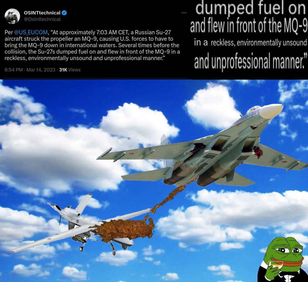 Phi công Su 27 bay lâu, mót nên đái vào con máy bay do thám RQ 9 của Mỹ, chả may làm rớt máy bay Mỹ, đến giò vẫn thấy Mỹ không phản ứng gì cả. Nhớ lại năm 2021 xảy ra khủng hoảng Máy bay Nga chặn đầu nã bom hàng không trước tàu khu trục của Anh. Lúc đó tụi Anh khiếp vía chạy mất dép về báo cáo bố Mỹ và mạ NATYO là thằng Nga nó dọa. Thé mà cuối cùng cũng êm chả thấy tụi kia có phản ứng gì. Thậm chí khi thấy tụi Anh về mách NATO, anh Pu em chỉ cười nhạt nói "Kể cả Nga đánh chìm tàu khu trục Anh thì cũng chả xảy ra cuộc chiến giữa Nga với NATO đâu".