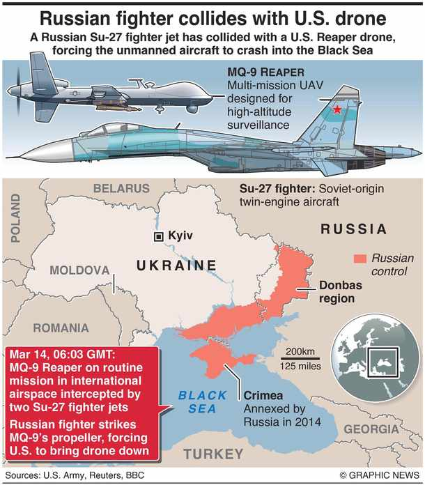 Bộ Quốc phòng Nga cho biết hôm thứ Ba rằng một máy bay không người lái MQ-9 của Mỹ đã rơi xuống Biển Đen vào buổi sáng do cơ động quá mạnh của chính nó, các máy bay chiến đấu của Nga đã không va chạm với MQ-9 và không sử dụng vũ khí chống máy bay Mỹ.