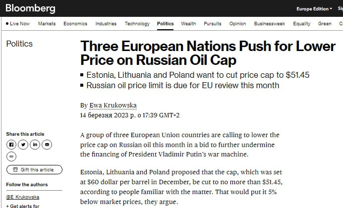 Estonia, Litva và Ba Lan đã đề xuất giảm giá tối đa đối với dầu của Nga gần 10 đô la - từ 60 đô la một thùng xuống còn 51,45 đô la, Bloomberg viết.