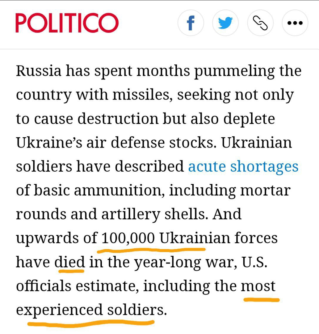 ‘Ukraine doesn’t have any time to waste’: U.S. races to prepare Kyiv for spring offensive https://www.politico.com/news/2023/03/15/dod-ukraine-war-supplies-00087291 And upwards of 100,000 Ukrainian forces have died in the year-long war, U.S. officials estimate, including the most experienced soldiers.