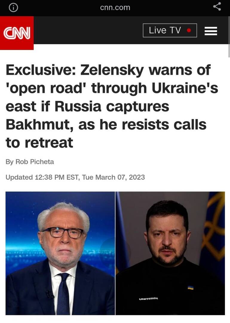 "Quân đội Nga sẽ có "con đường rộng mở" để chiếm các thành phố quan trọng ở miền đông Ukraine nếu họ giành quyền kiểm soát Bakhmut", Tổng thống Volodymyr Zelensky cảnh báo trong một cuộc phỏng vấn với CNN, khi ông bảo vệ quyết định giữ lực lượng Ukraine ở thành phố bị bao vây.