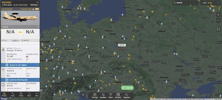 Máy bay kiểm soát và cảnh báo sớm trên không E-3G Sentry (AWACS) của Không quân Hoa Kỳ đang bay qua phía đông nam Ba Lan, hướng tới biên giới Ba Lan/Ukraine để giúp Kiev phối hợp phòng thủ.