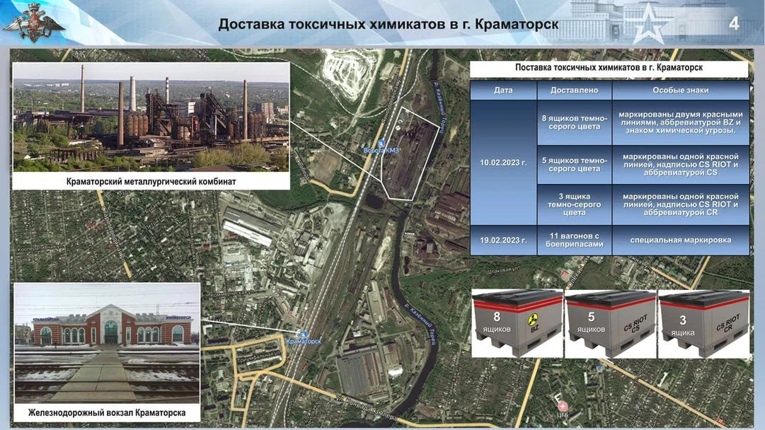 Ngoài ra, Bộ Quốc phòng Liên bang Nga nhận được thông tin cho biết, vào ngày 10/2/2023, một đoàn tàu đã đến Kramatorsk (Ukraine), trong đó một trong các toa tàu này chở mặt hàng hóa chất cùng với một nhóm công dân nước ngoài.