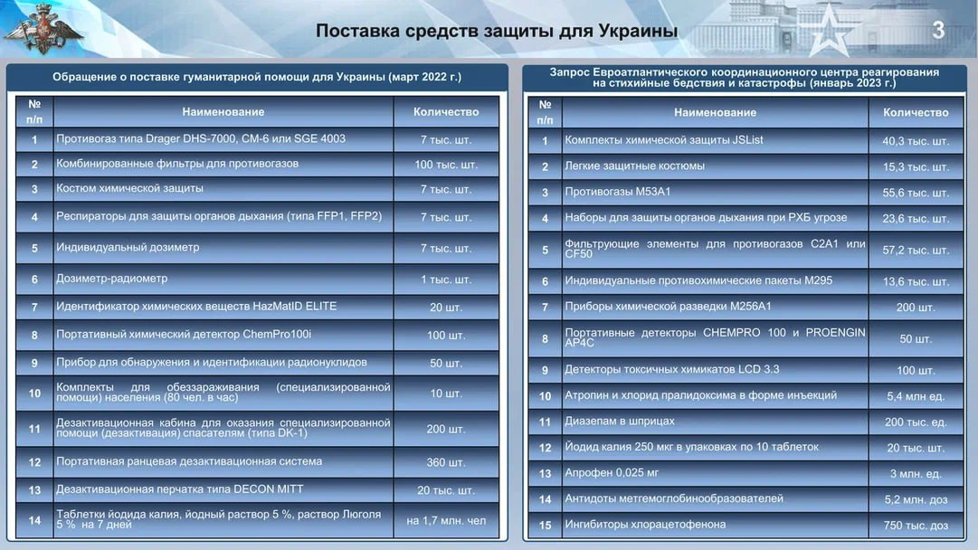 Theo thông tin chúng tôi có được, công tác chuẩn bị cho vụ khiêu khích này đang được tiến hành với mọi quy mô. Vào đầu năm 2023, Trung tâm điều phối ứng phó tai nạn và thảm họa Châu Âu-Đại Tây Dương đã lên kế hoạch cung cấp cho Ukraine một lô lớn thiết bị bảo hộ cá nhân. Để minh chứng nhận định này, chúng tôi xin trích dẫn: “... Quân đội Nga đã sử dụng đạn dược có thành phần phốt pho và có thể sử dụng các chất độc hại một khi tình hình xung đột có thể leo thang và trở nên trầm trọng hơn...".