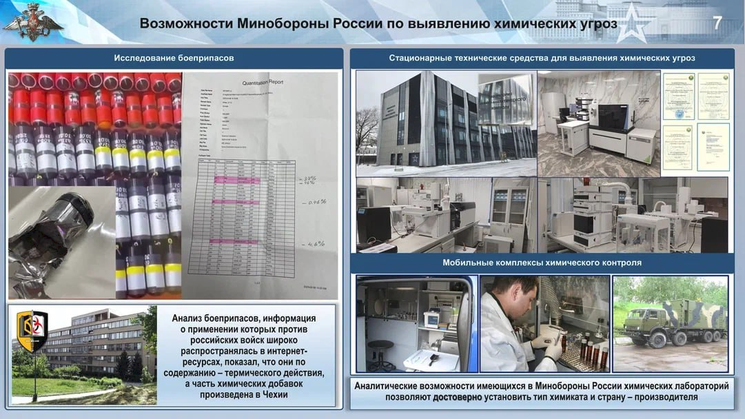 Khả năng phân tích của các phòng thí nghiệm hóa học có sẵn trong Bộ Quốc phòng Nga cho phép xác định một cách đáng tin cậy không chỉ loại hóa chất được sử dụng mà còn cả quốc gia sản xuất các hóa chất đó.