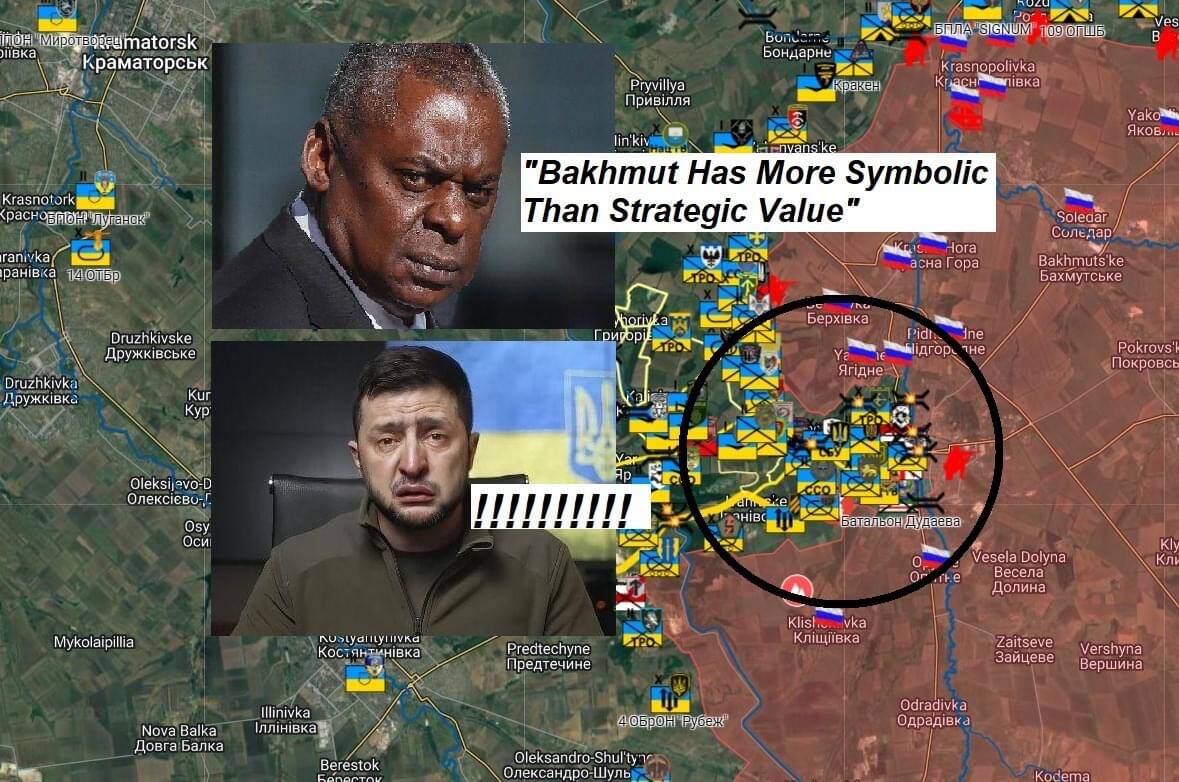"BAKHMUT MANG TÍNH BIỂU TƯỢNG HƠN LÀ GIÁ TRỊ CHIẾN LƯỢC. VIỆC BAKHMUT THẤT THỦ KHÔNG NHẤT THIẾT MANG Ý NGHĨA NGA ĐÃ THAY ĐỔI CỤC DIỆN CUỘC CHIẾN NÀY" BỘ TRƯỞNG QUỐC PHÒNG MỸ LLOYD AUSTIN NÓI VỚI PHÓNG VIÊN TRONG CHUYẾN THĂM JORDAN HÔM NAY.