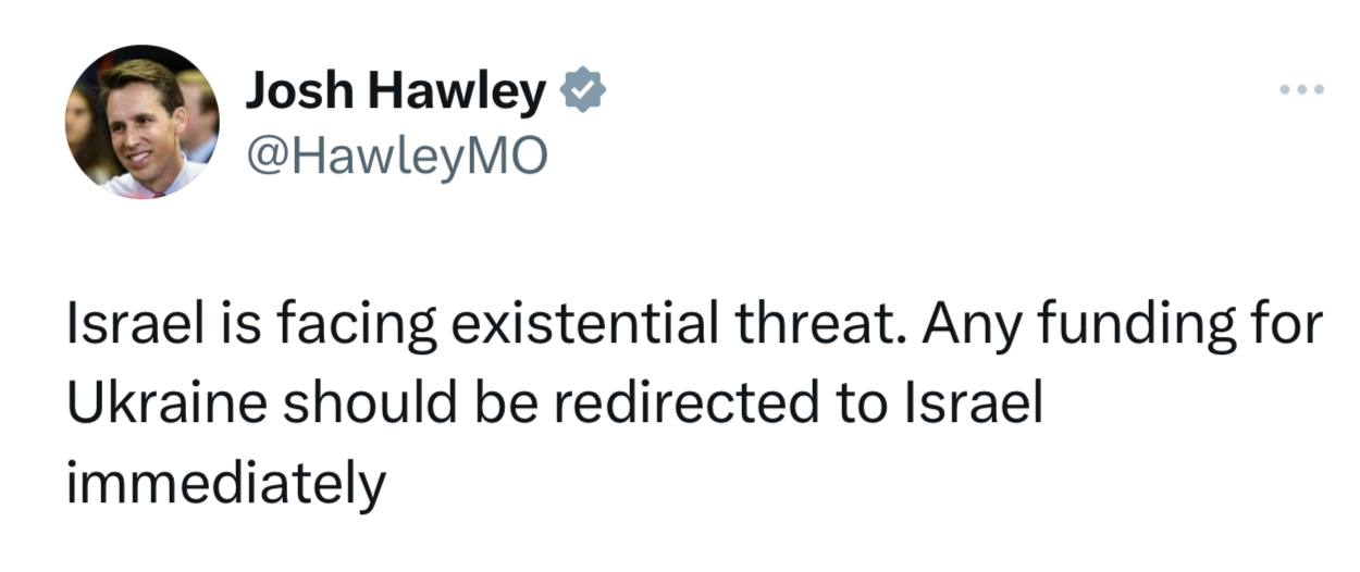 Thượng nghị sĩ Hoa Kỳ Josh Hawley: Israel đang đối mặt với mối đe dọa hiện hữu. Bất kỳ khoản tài trợ nào cho Ukraina phải ngay lập tức chuyển hướng đến Israel.