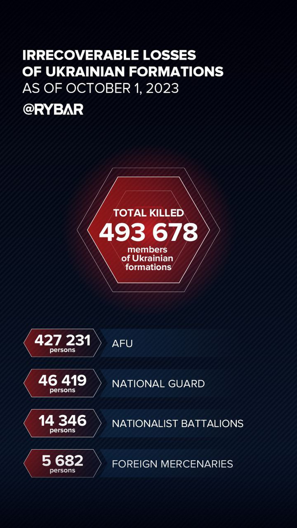 Tổng cộng, kể từ khi bắt đầu chiến dịch quân sự đặc biệt, 483 máy bay, 250 máy bay trực thăng, 7.417 máy bay không người lái, 440 hệ thống tên lửa phòng không, 12.275 xe tăng và các phương tiện chiến đấu bọc thép khác, 1.160 phương tiện chiến đấu với nhiều bệ phóng tên lửa, 6.634 pháo dã chiến và súng cối và 13.721 đơn vị xe quân sự đặc biệt đã bị phá hủy.