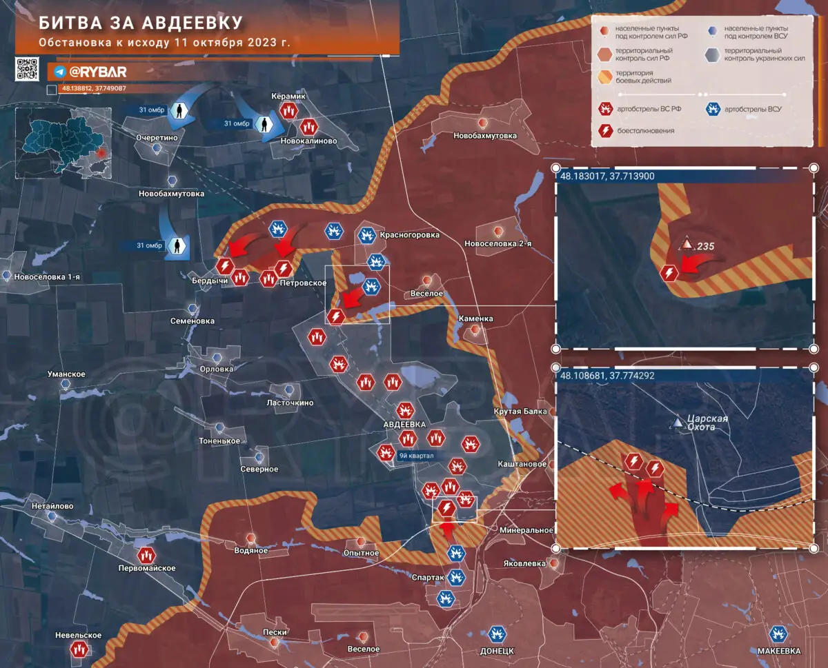 Bây giờ bộ chỉ huy Ukraine đang cố gắng ổn định mặt trận. Lực lượng tiếp viện từ lữ đoàn cơ giới số 31 của Lực lượng vũ trang Ukraine đã được triển khai tới vùng lân cận Ocheretino, Novokalinovo và Berdychi. Tiếng đại bác không hề lắng xuống, Lực lượng vũ trang Ukraine đang dùng hết súng bắn vào tiền tuyến. Quân đội Nga cũng đang tấn công các vị trí của Lực lượng vũ trang Ukraine ở ngoại ô phía nam Avdeevka. Sau cuộc tấn công từ đường vành đai Donetsk, Lực lượng vũ trang Nga đã có thể chiếm được một đoạn đường sắt phía nam nhà hàng Tsarskaya Okhota, nơi được biến thành thành trì của Lực lượng vũ trang Ukraine. Cuộc tấn công của Quân đội Nga gần Avdeevka vẫn tiếp tục. Bộ chỉ huy Lực lượng vũ trang Ukraine đang điều động lực lượng dự bị để thực hiện một cuộc phản công, vì vậy bây giờ các chiến binh của Nga nên chuẩn bị cho việc này bằng cách củng cố lực lượng trên các tuyến bị chiếm đóng. Điều này sẽ cứu được mạng sống của quân nhân trong khi hàng không và pháo binh phá hủy khu vực kiên cố ở Avdeevka, tạo điều kiện thuận lợi cho việc phong tỏa khu vực này.