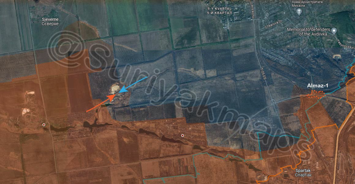 Tình hình tại mặt trận Avdivka: Các cuộc giao tranh giữa Quân đội Nga và Quân đội Ukraine đang diễn ra tại mỏ đá phía tây bắc Opytne/Опитне. Trong khi đó, quân đội Nga củng cố hoàn toàn các vị trí của mình tại các công sự Almaz-1 mới chiếm được, liền kề với tuyến đường sắt phía nam Avdivka/Авдіївка.