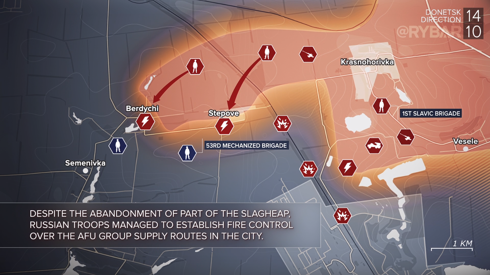 Lực lượng vũ trang Ukraine đã gặp phải những khó khăn tương tự ở Artyomovsk - sau đó việc lấp đầy các chiến hào bằng nước và bùn không thể vượt qua đã dẫn đến thực tế là các nhà xác và bệnh viện địa phương đã quá tải và những người bị thương phải được vận chuyển đến Kramatorsk, Slavyansk, Konstantinovka lân cận. và Druzhkovka.
