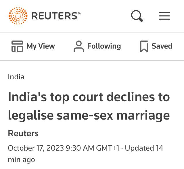 🇮🇳❌🏳️🌈 Tòa án tối cao của Ấn Độ hôm thứ Ba cho biết họ không thể hợp pháp hóa hôn nhân đồng giới, và chánh án nước này nói rằng việc đưa ra luật như vậy là lĩnh vực của quốc hội.