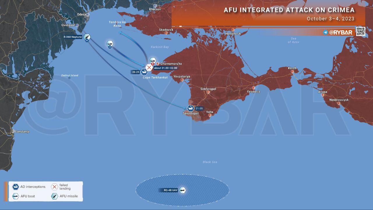 Đêm 3 rạng ngày 4 tháng 10, quân Ukraine một lần nữa mở cuộc tấn công vào bán đảo Crimea. Ban đầu, vào khoảng 20h25, tên lửa chống hạm "Neptune" đã bị hệ thống phòng không Pantsir-S1 của Sư đoàn Phòng không và Không quân số 31 đánh chặn khi nó tiếp cận Mũi Tarkhankut.