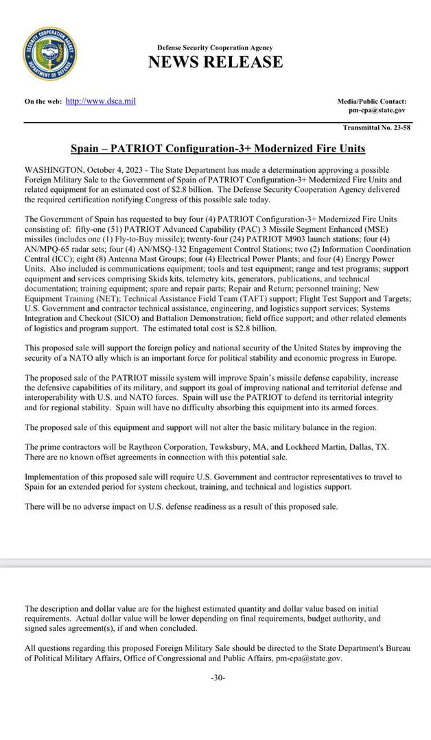 Bộ Ngoại giao Mỹ đã phê duyệt khả năng bán cho Tây Ban Nha 4 hệ thống phòng không Patriot bao gồm 24 bệ phóng và 51 tên lửa phòng không dẫn đường, 4 radar AN/MPQ-65 và các thiết bị khác trị giá 2,8 tỷ USD.