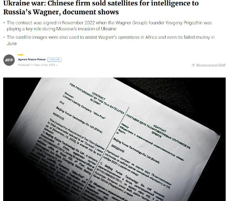 AFP: PMC Wagner vào năm 2022 đã ký hợp đồng với một công ty Trung Quốc để mua hai vệ tinh và sử dụng hình ảnh từ chúng, hỗ trợ công việc tình báo của họ trogn chiến dịchở Ukraine của Nga.