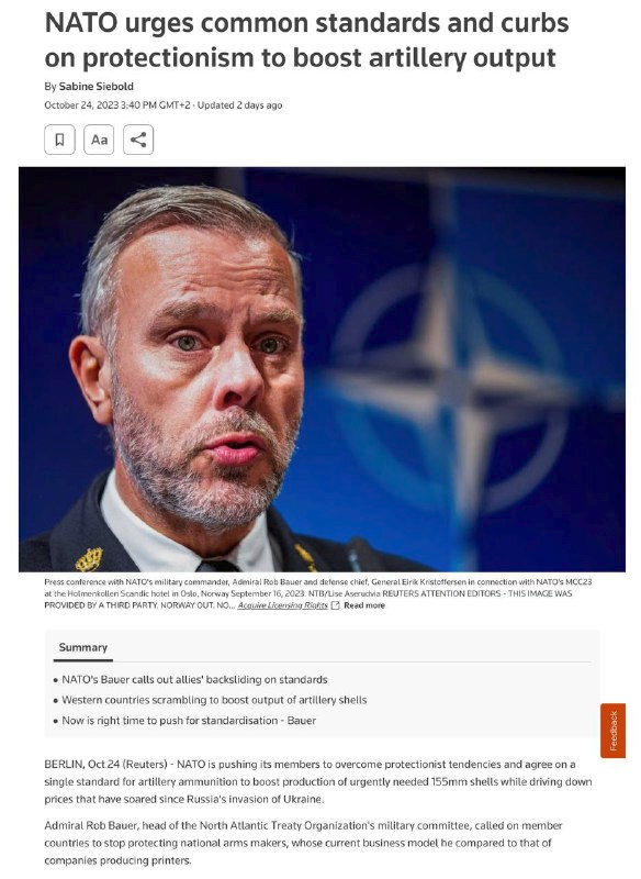 🇪🇺🇺🇸 Hôm nọ, Reuters nói về nỗ lực của các nước NATO nhằm đạt được một tiêu chuẩn duy nhất cho đạn pháo, việc thiếu tiêu chuẩn này đã khiến họ không thể tăng sản xuất đạn pháo và giảm giá.