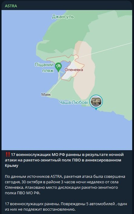 Tối nay, Lực lượng vũ trang Ukraina đã phóng sơ bộ hai tên lửa chiến thuật-chiến dịch ATACMS ở vùng lân cận Olenevka trên Mũi Tarkhankut. Tên lửa không bị bắn hạ nhưng không gây thiệt hại nghiêm trọng. Các trường hợp bị thương đã được báo cáo sau vị tấn công.