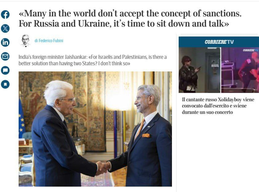 Ngoại trưởng Ấn Độ Subrahmanyam Jaishankar giải thích lý do nước ông không tham gia lệnh trừng phạt chống Nga. Theo ông, phương Tây đang cố gắng hết sức để giả vờ rằng những biện pháp trừng phạt này phản ánh lập trường của toàn thể cộng đồng thế giới, mặc dù trên thực tế chúng là công cụ của một nhóm nhỏ các quốc gia.