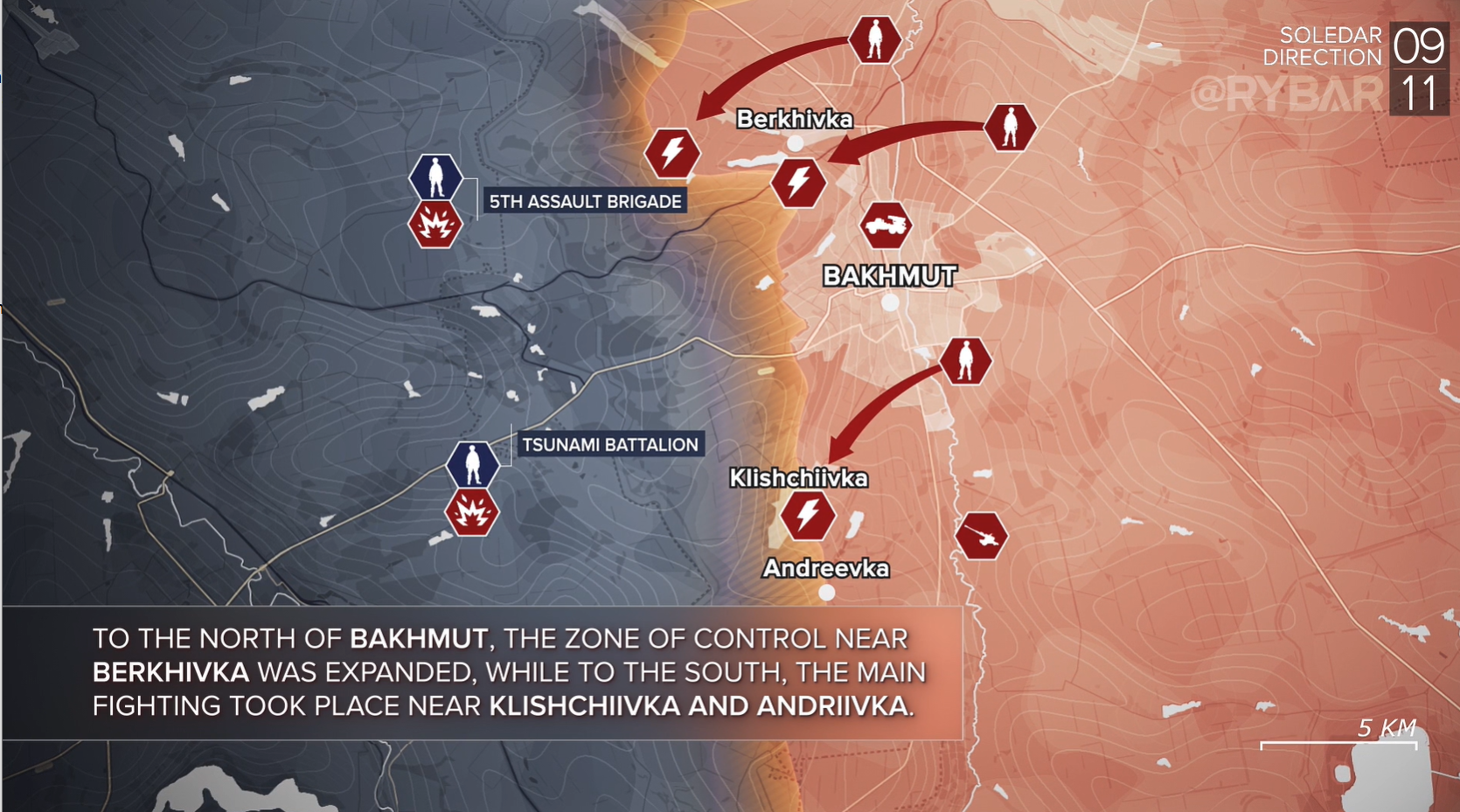 ▪️Trên hướng Soledar, quân Nga phản công, lợi dụng việc quân địch di chuyển về khu vực Avdeevsky. Về phía bắc Bakhmut, vùng kiểm soát tại Berkhovka được mở rộng, và về phía nam, các trận chiến chính diễn ra ở khu vực Kleshcheevka và Andreevka.