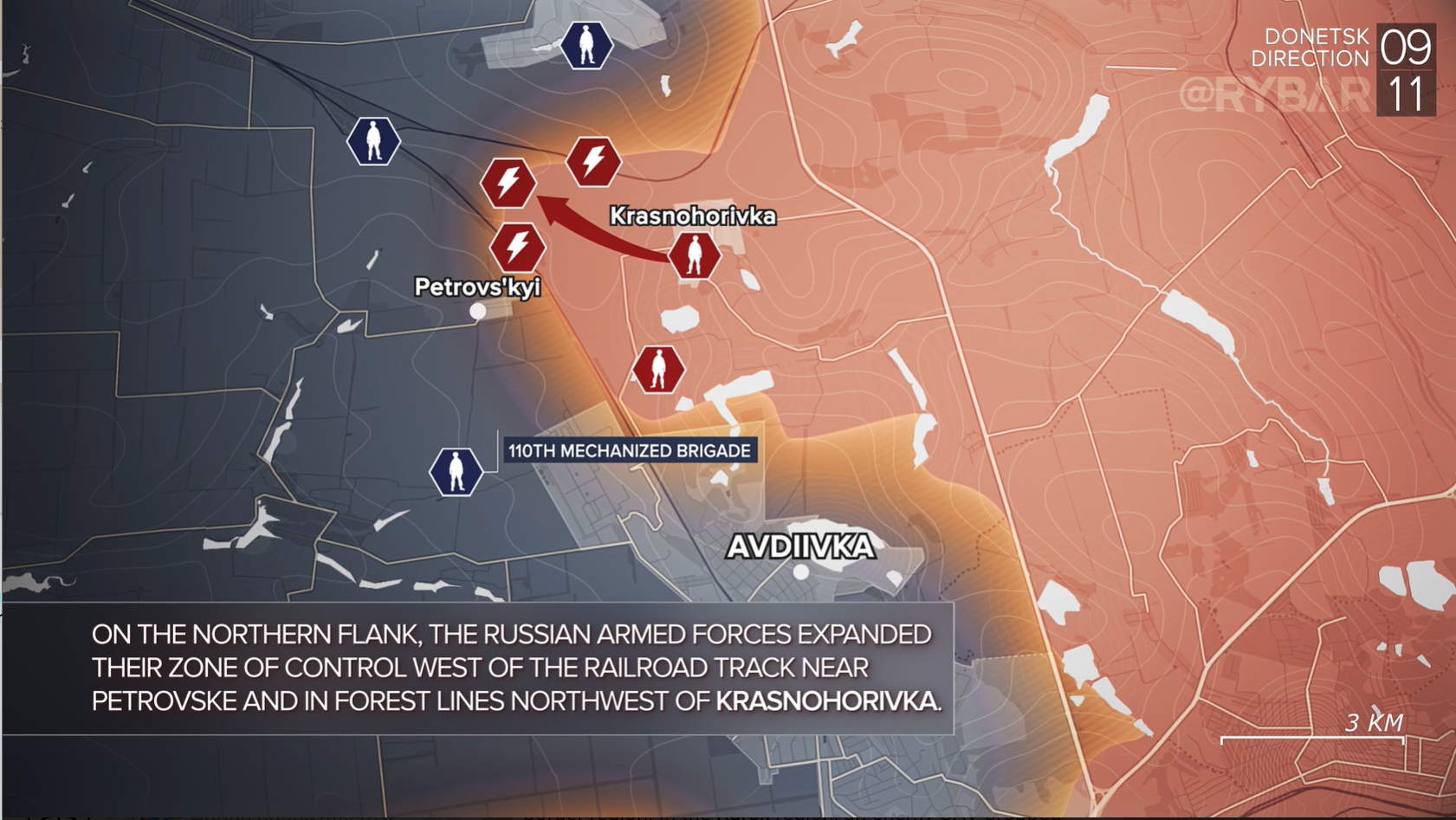 ▪️Trên hướng Donetsk, các đơn vị Nga tiếp tục hoạt động bao vây khu vực kiên cố Avdeevsky. Ở sườn phía bắc, Lực lượng vũ trang Nga đã mở rộng vùng kiểm soát ở phía tây đường ray gần Petrovsky và tại cuộc đổ bộ về phía tây bắc Krasnogorovka.