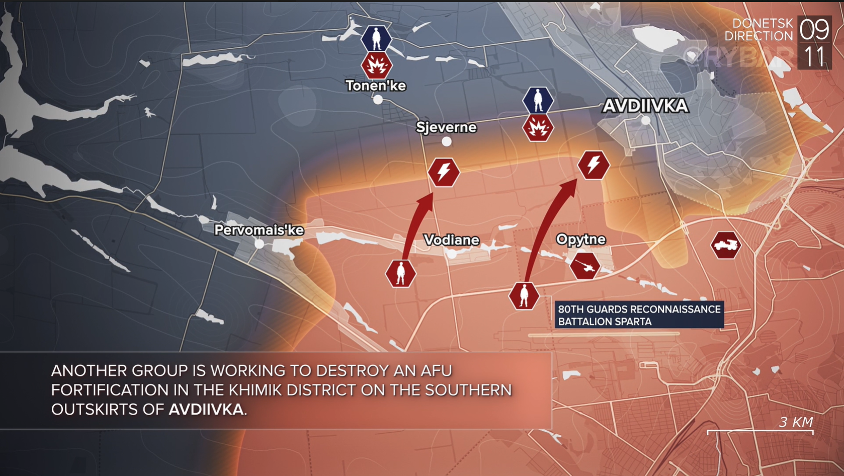 Phía sườn Nam, RF tiến tục đẩy về hướng Sjeverne, một mũi khác đang tìm cách xóa sổ điểm phòng thủ của AFU trong khu hóa chất ngoài rìa Avdeevka.