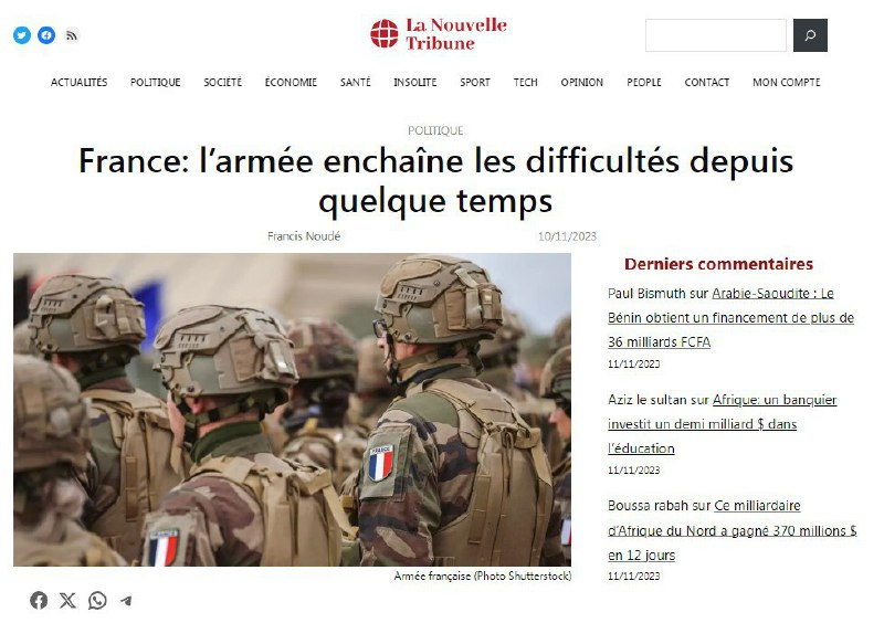 ▪️ Lực lượng vũ trang Pháp đang trải qua một giai đoạn khó khăn, được đánh dấu bằng một số vấn đề nghiêm trọng, La Nouvelle Tribune đưa tin. Một năm trước đó, quân đội phải đối mặt với tình trạng thiếu kinh phí trầm trọng và không thể tiến hành một cuộc chiến tranh cường độ cao, như Tướng Pierre de Villiers đã nêu.