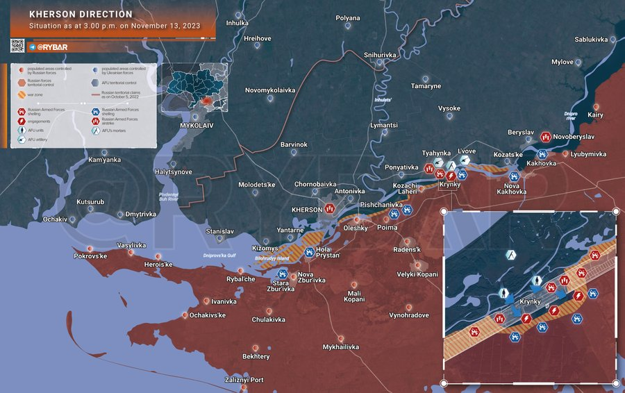 Theo hướng Kherson, trong hai ngày qua, bộ chỉ huy nhóm quân Katran đã luân phiên các đơn vị tiền phương hoạt động ở Krynki. Do hỏa lực dữ dội của pháo binh Nga, lực lượng xung kích của Hải quân Ukraina thưa dần, buộc địch phải tăng cường thêm lực lượng cho đầu cầu.