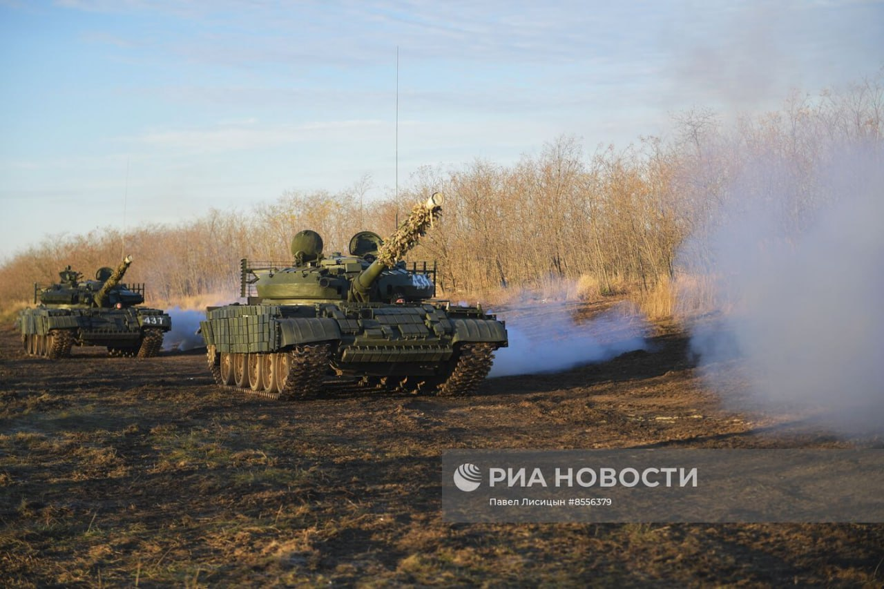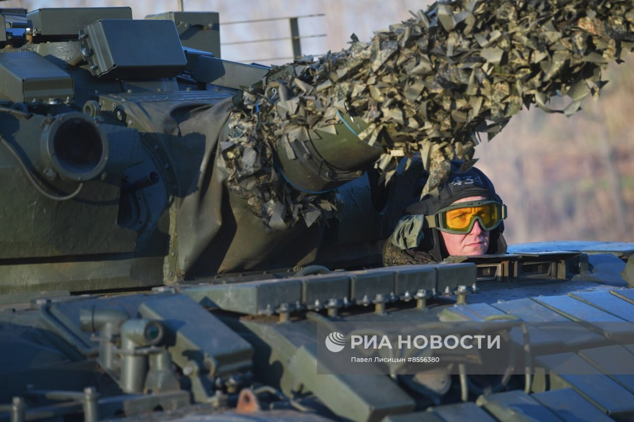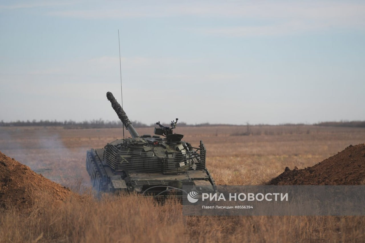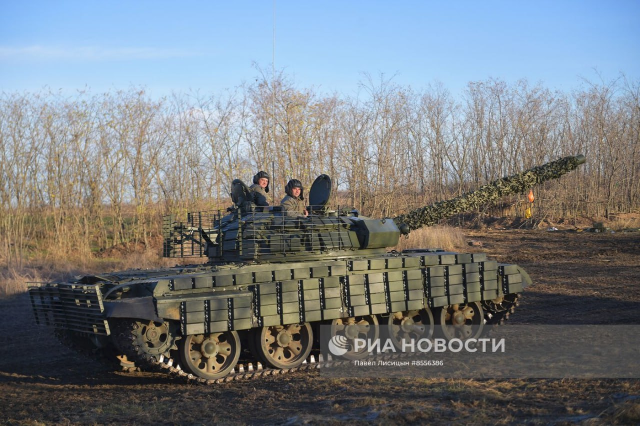 Xe tăng T-62M được hiện đại hóa tại Nhà máy sửa chữa thiết giáp số 103 với giáp Kontakt-1, lưới chống bảo vệ và ống ngắm ảnh nhiệt 1PN96MT trong quá trình huấn luyện bắn tại sân tập ở vùng Zaporozhye.