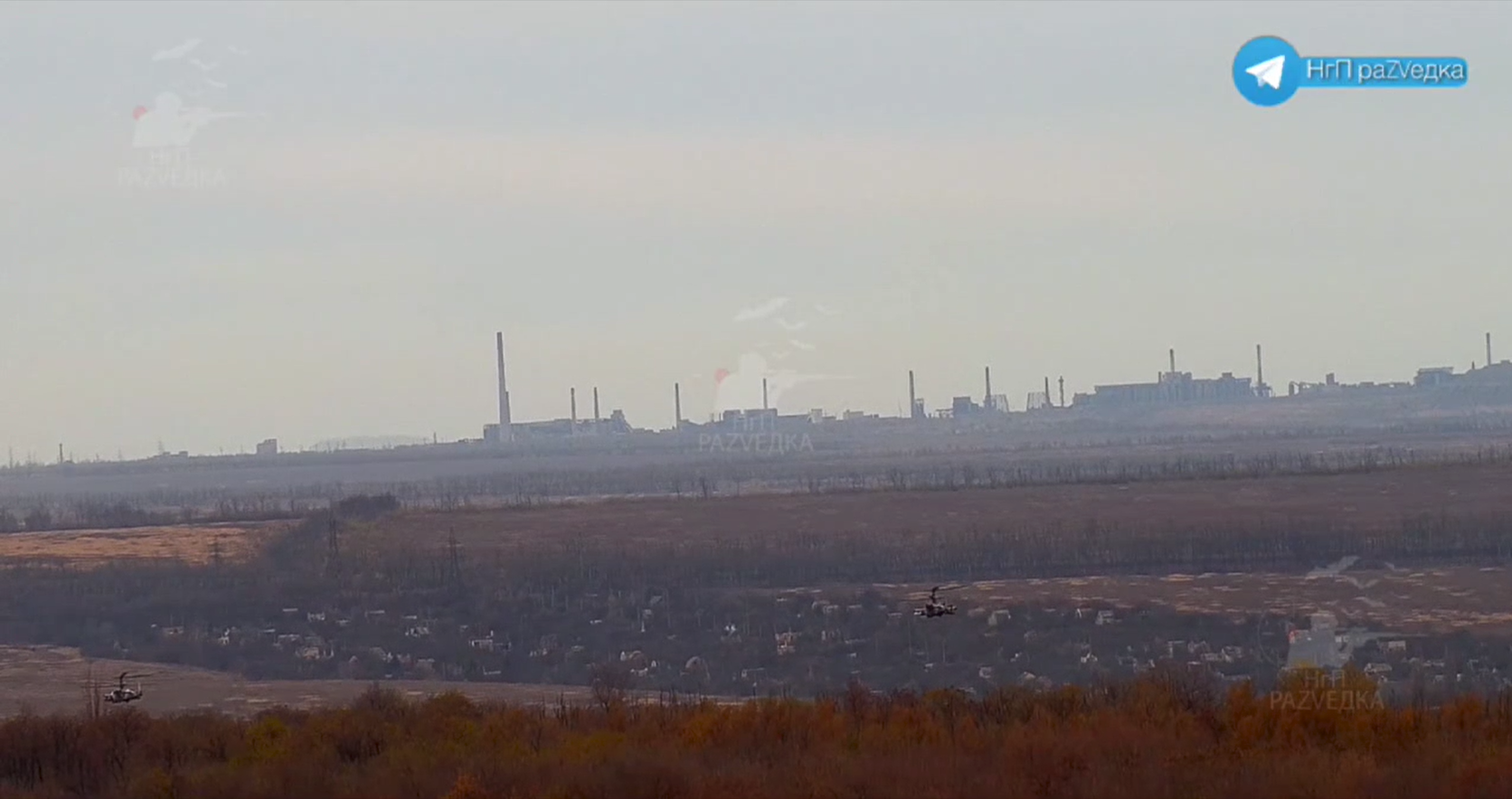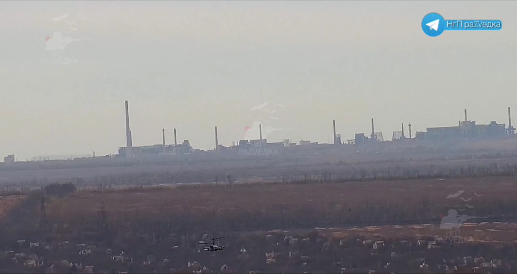 Máy bay trực thăng tấn công Ka-52 của Nga ở khu vực Avdeevka trong bối cảnh nhà máy luyện cốc Avdeevka. Theo góc quan sát thì hình như bên kia đường tàu nhìn vào. Máu liều không ai bằng.